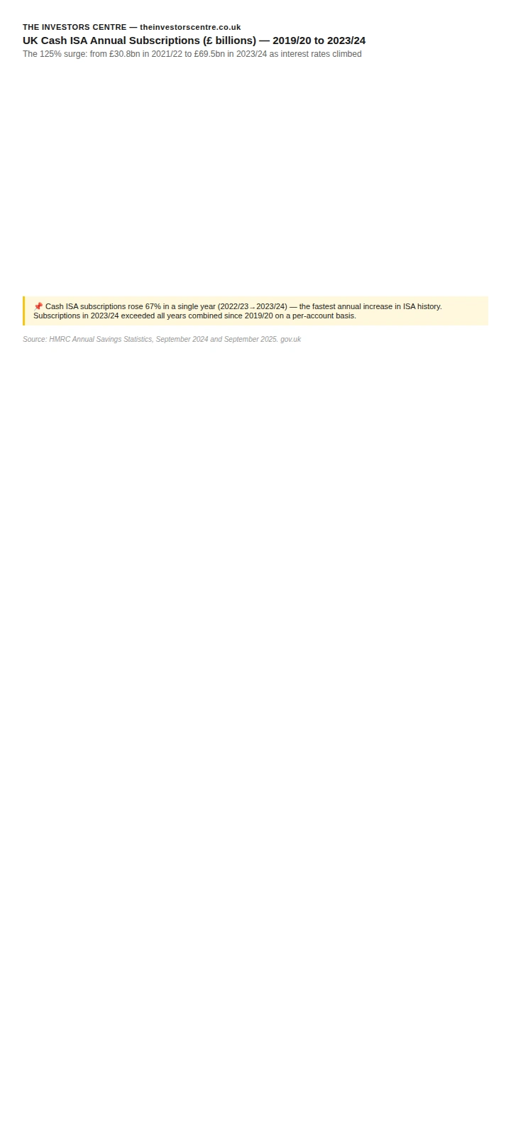 £69.5 billion was subscribed into Cash ISAs during 2023/24 — a 67% increase on the £41.6 billion subscribed in 2022/23, and more than double the £30.8 billion subscribed in 2021/22. Over two years, Cash ISA subscriptions rose 125% while Stocks and Shares ISA subscriptions fell 9% over the same period.