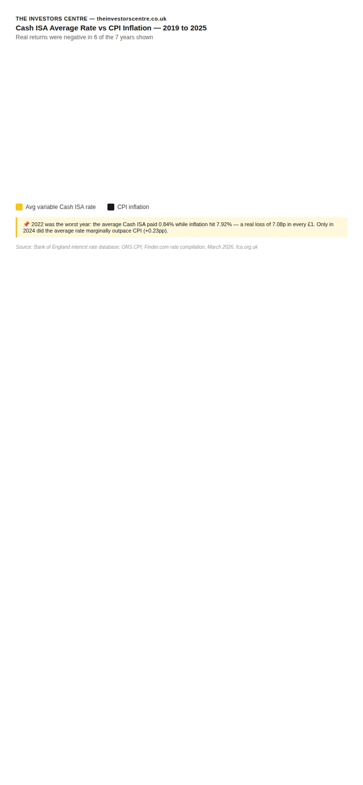 - Negative in 6 of 7 years — Cash ISA real returns were negative in 6 of the last 7 years (2019–2025). The worst year was 2022, when the average variable rate of 0.84% was dwarfed by CPI inflation of 7.92%.