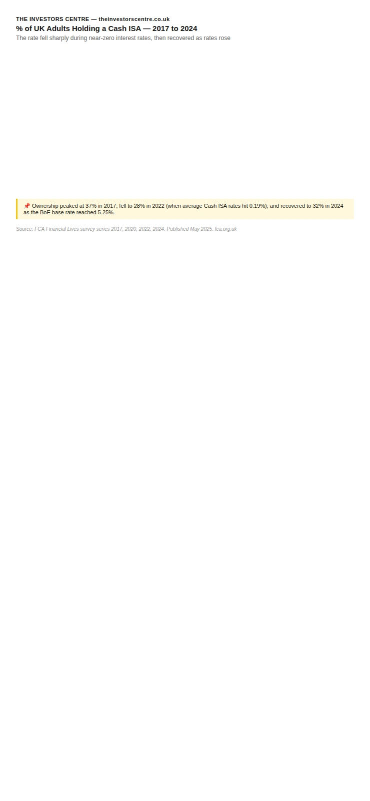 - 32% of UK adults held a Cash ISA in 2024, up from a trough of 28% in 2022 but still well below the 37% peak in 2017.