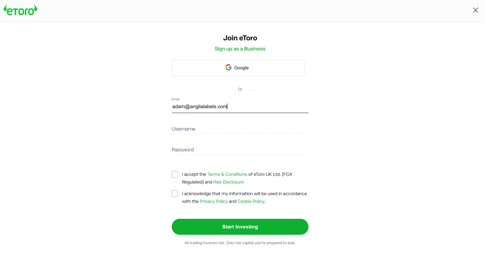 Visit the eToro registration page through one of our links and create your account. You’ll need to provide:
