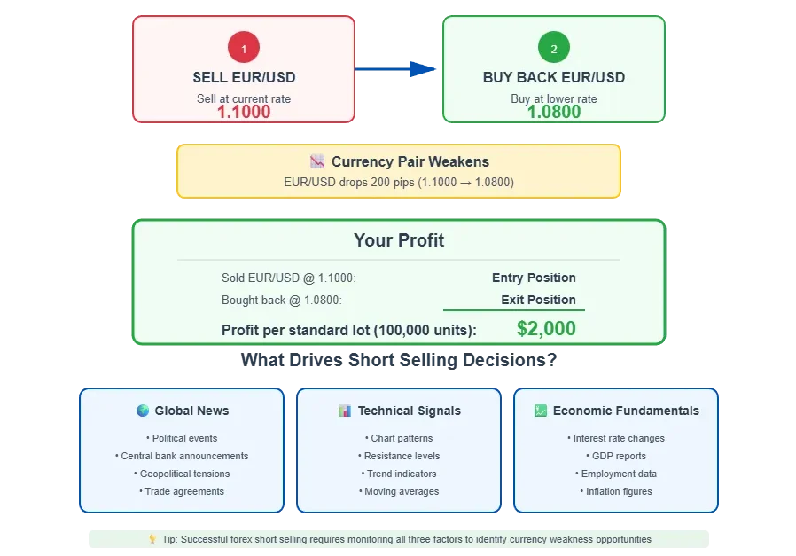 Short selling in forex means betting against a currency’s strength. You sell a currency pair, expecting its value to decline, then buy it back at a lower price. This practice leverages global news, technical signals, and economic fundamentals to capture profits from downward movements.