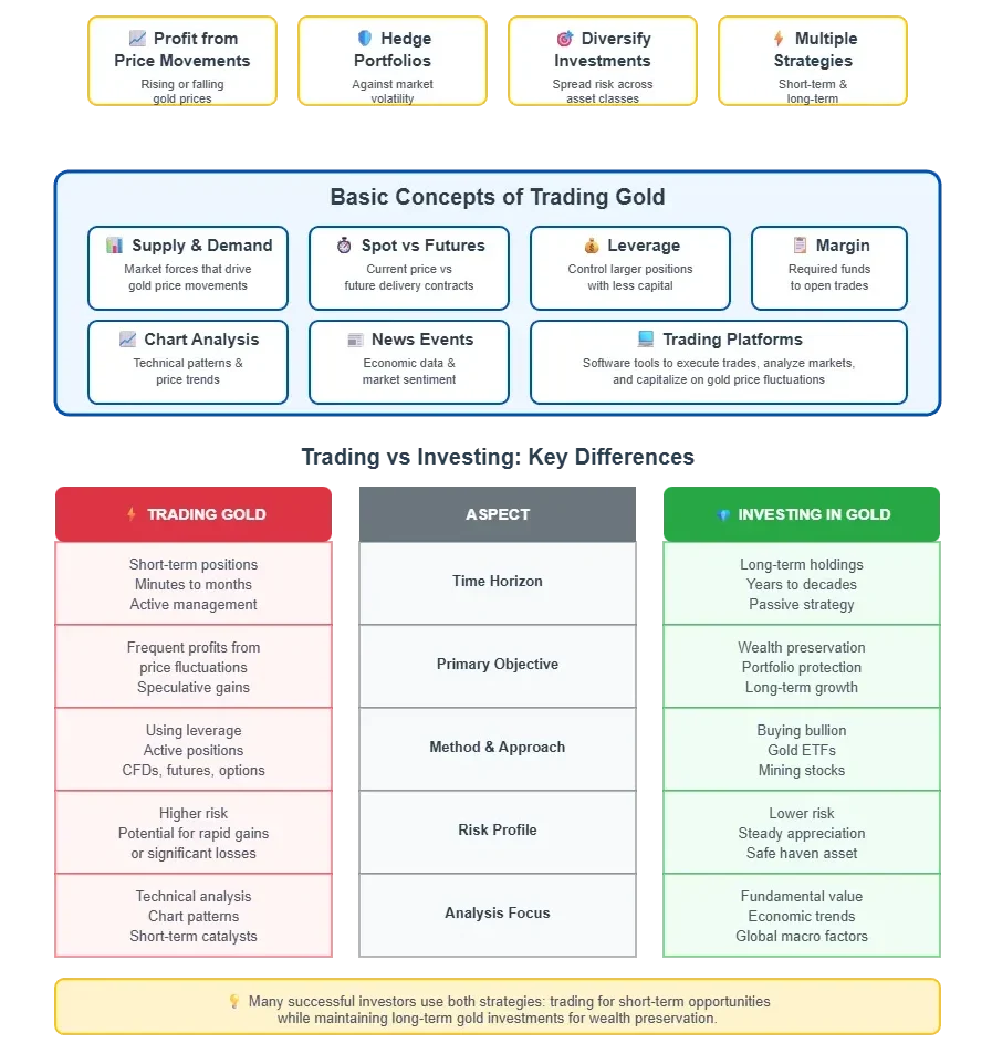 Trading gold focuses on short-term price movements using leverage and active positions, aiming for frequent profits. Investing in gold typically involves buying bullion, ETFs, or stocks for long-term growth and portfolio protection, emphasizing wealth preservation rather than rapid speculative gains.