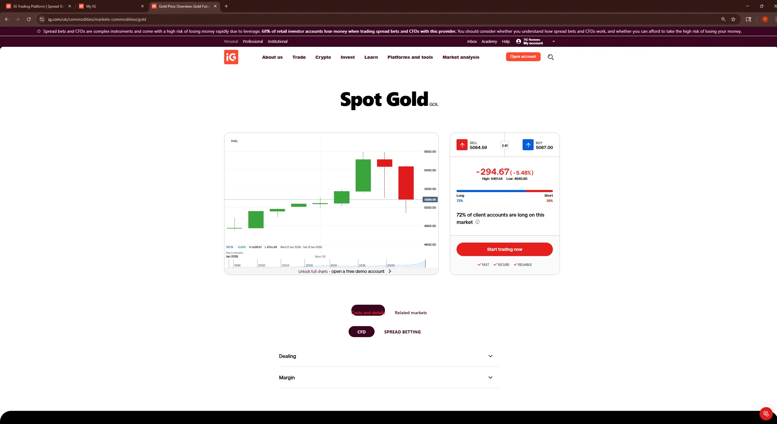 IG is the best broker for trading gold in the UK, offering spot gold, futures, options, ETFs, and 50+ mining shares from one FCA-regulated account (FCA #195355). IG’s 0.30-point spread costs ~£24 per lot—CMC Markets is cheaper at £16/lot, but IG’s instrument range is unmatched for serious gold traders.